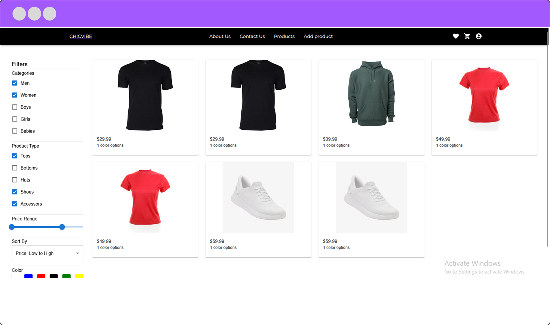 A clothing e-commerce web app built with React, JavaScript, Material UI, CSS, and React Router. Users can sign up, log in, browse products, apply filters (size, color, gender, type), add variants to the cart, view total cost, and check out. The app provides a smooth shopping experience with a clean UI